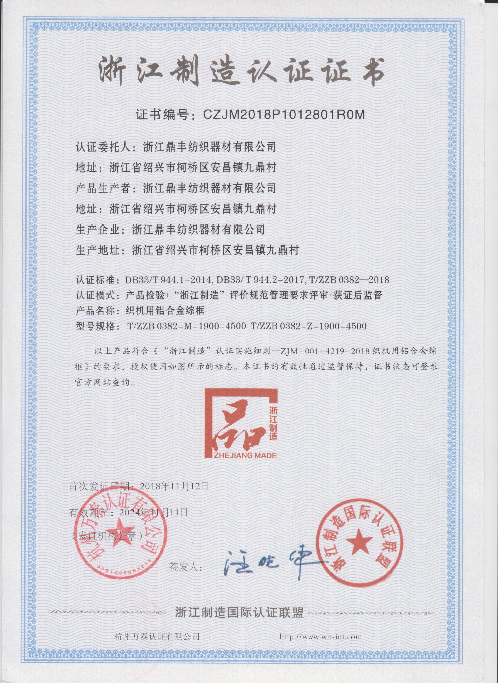 1、貴公司是一家專業(yè)生產(chǎn)各類無梭織機(jī)鋁合金鋼筘、綜框、鋼片綜、停經(jīng)片、經(jīng)軸、織軸和卷布輥等產(chǎn)品及配件的民營企業(yè)。公司成立30多年迅速發(fā)展、占領(lǐng)市場的秘決是什么?余定雅:是高品質(zhì)的產(chǎn)品,完善的售后服務(wù)和大規(guī)模的生產(chǎn)能力保證了浙江鼎豐紡織器材有限公司的產(chǎn)品銷售量在國內(nèi)獨(dú)占鰲頭。為了與全球市場經(jīng)濟(jì)接軌,鼎豐紡